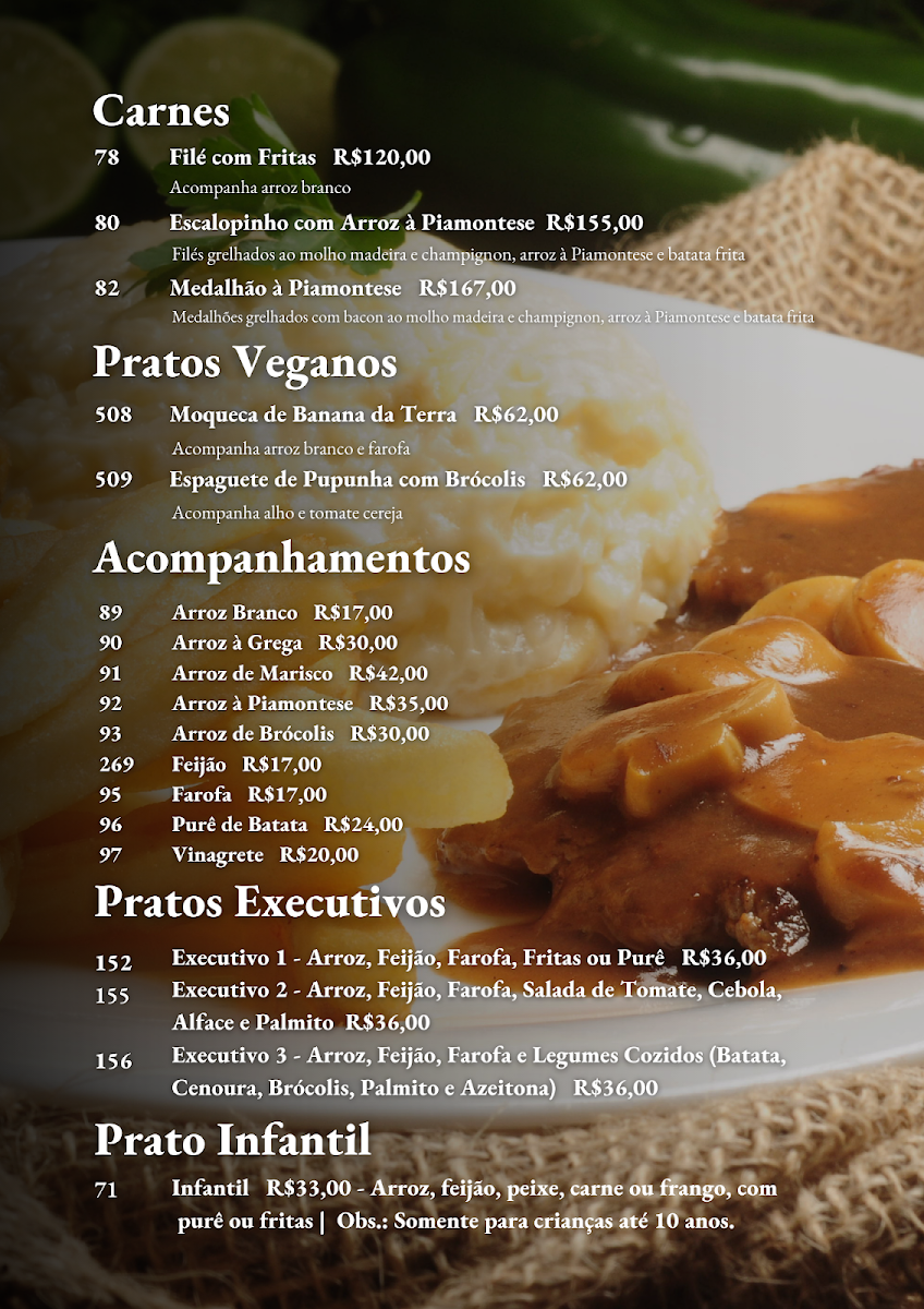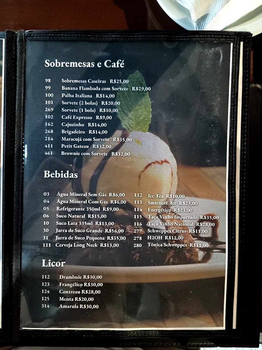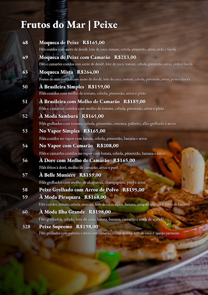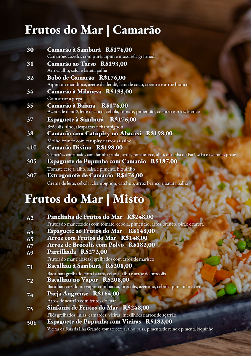 Highlights such as the bobó de camarão, camarão divino, and lula recheada with farofa showcase the rich textures and vibrant tastes of the sea. These dishes pair naturally with refreshing choices like iced tea or a classic piña colada, fitting perfectly within the welcoming atmosphere of this Angra dos Reis spot.